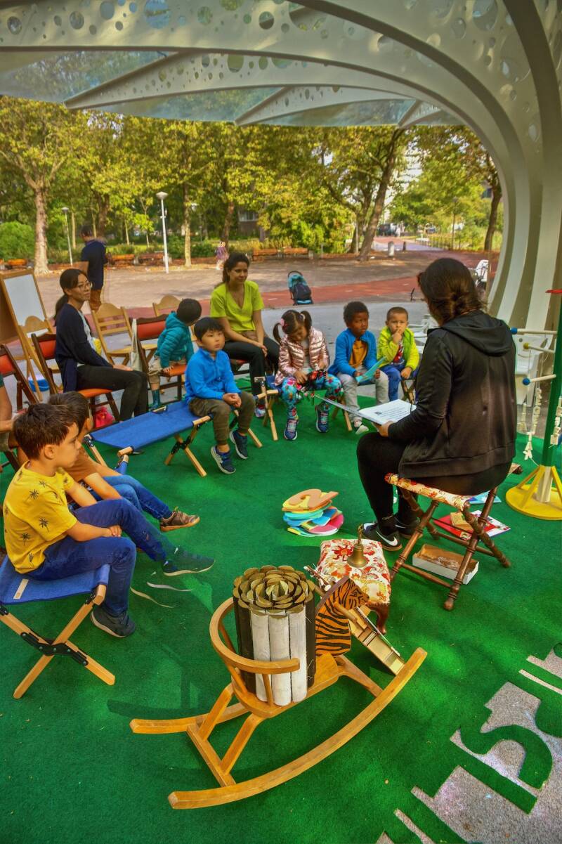 Zelfs het zonnetje kwam een kijkje nemen bij de tweede voorstelling van LEESSPIN SPEELT BUITEN.
